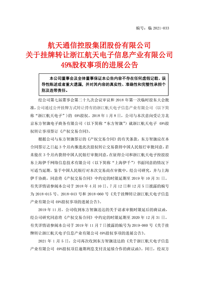 航天通信關于掛牌轉讓浙江航天電子信息產業有限公司49%股權事項的進展公告