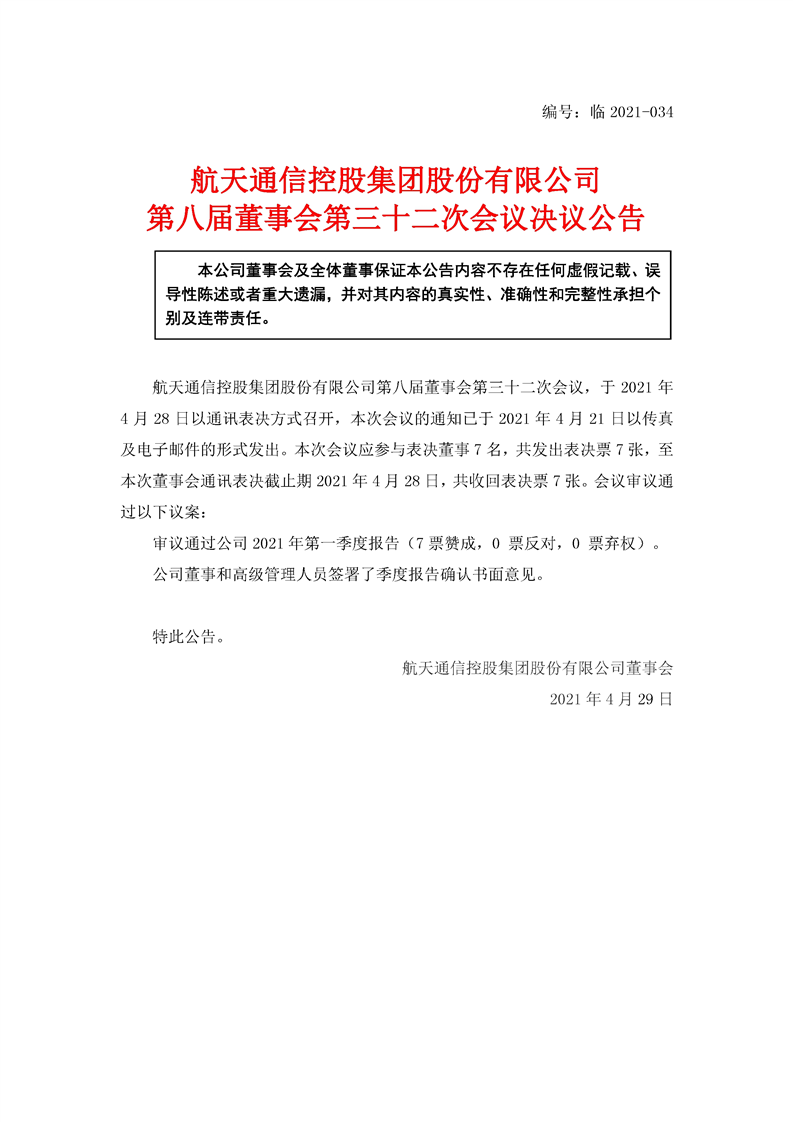 航天通信控股集團(tuán)股份有限公司八屆三十二次董事會決議公告