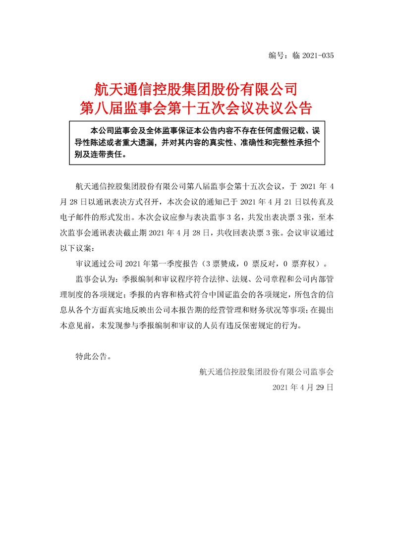 航天通信控股集團股份有限公司八屆十五次監(jiān)事會決議公告