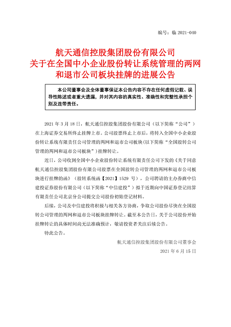航天通信控股集團股份有限公司關于在全國中小企業股份轉讓系統管理的兩網和退市公司板塊掛牌的進展公告