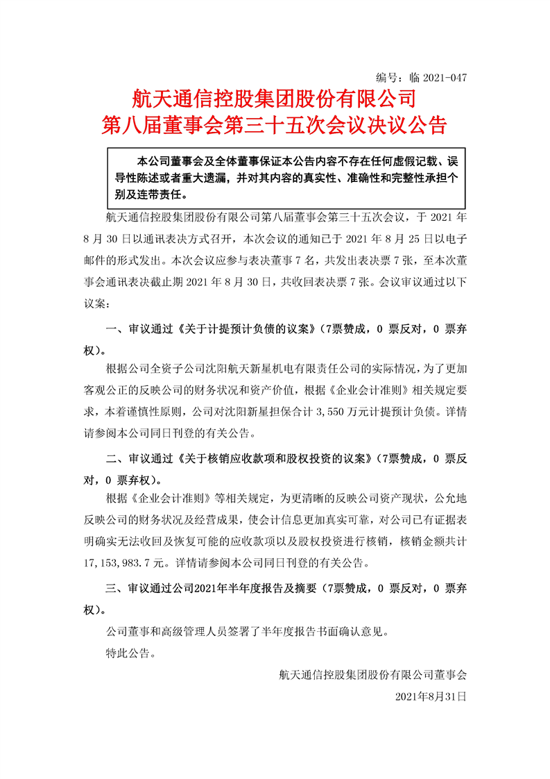 航天通信控股集團股份有限公司八屆三十五次董事會決議公告