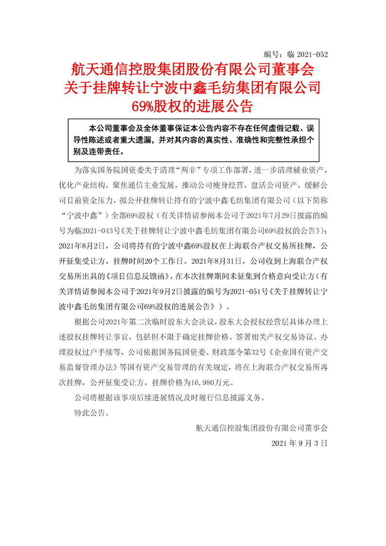 航天通信關(guān)于掛牌轉(zhuǎn)讓寧波中鑫毛紡集團(tuán)有限公司69%股權(quán)的進(jìn)展公告